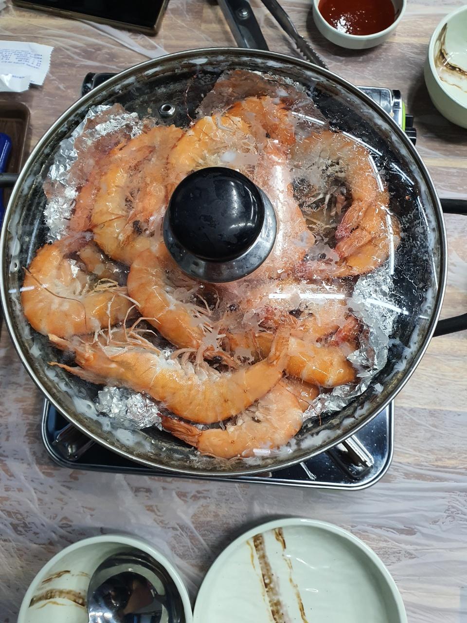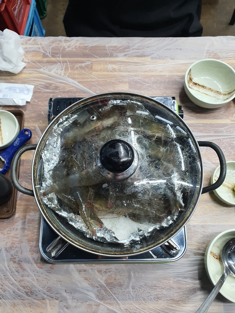 사이드반찬과 소주가 나온 뒤, 곧바로 이모님이 버너위에 새우가 가득 담긴 냄비를 저희 테이블에 놔주셨어요!