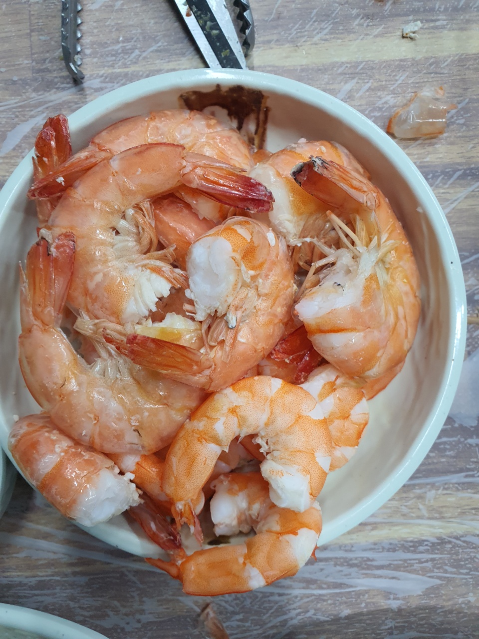 새우를 하나까고 하나 먹는데 시간이 꽤 걸려 답답해서 친구와 저는 미리 대가리를 자른 후 새우껍질을 까서 분리해두었어요ㅎㅎ (대가리만 따로 분리해둔 이유는 나중에 보여드리도록할게요!!)